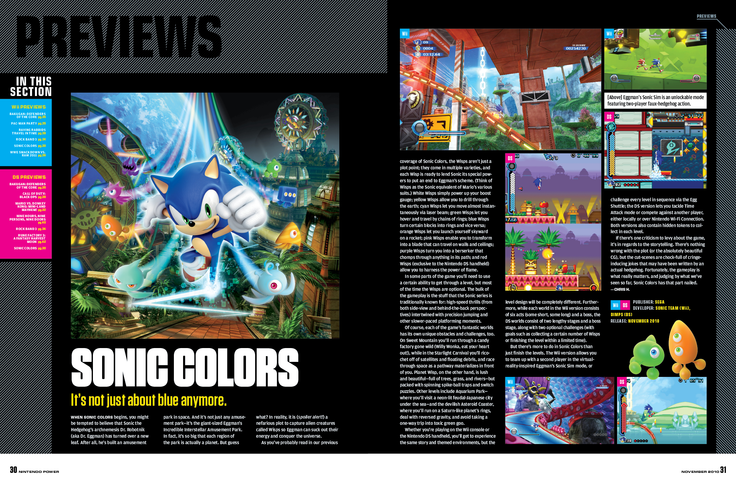 A Nintendo Power postou algumas páginas da sua próxima edição. Duas páginas são as previews das versões do Sonic Colors que revela novas informações sobre o jogo: "*O Wisp Roxo transforma o Sonic em um "Berserker que destrói tudo em seu caminho" *Asteroid Coaster Zone é revelada com a seguinte descrição: Corra em anéis planetários semelhantes aos de Saturno, lide com gravidade invertira e uma meleca verde tóxica. * A versão Wii do jogo contém seis zonas por ato, algumas curtas e outras longas e o chefe, enquanto a versão DS contém 2 grandes atos por zona e o boss. * Assim como revelado anteriormente a Sonic Simulator, onde você pode ir jogar em coop com um amigo, você pode também "desafiar cada nível em sequência através da Egg Shuttle." * A versão DS tem um modo Time Attack e também permite competir contra amigos localmente ou via Nintendo Wi-Fi Connection." |